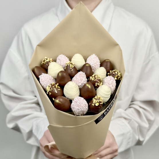 Состав: клубника в шоколаде 250 г. Букет из свежей клубники в бельгийском шоколаде.