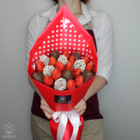 Букет из свежей клубники в бельгийском шоколаде. Клубника держится на каркасе из шпажек. Готовый букет упаковывается в прозрачную слюду.